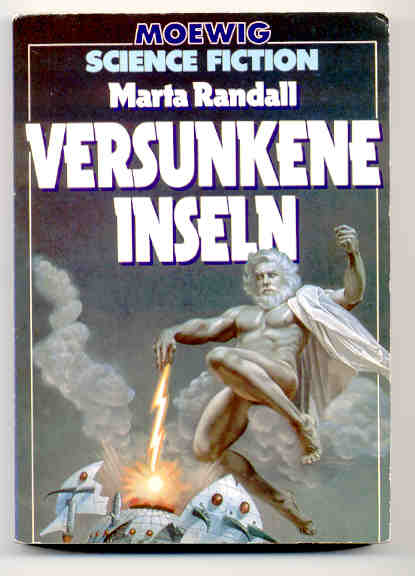 Here's the German cover (Moewig, 1982). It has even less to do with the book than the American covers: in the book there are no satellites being destroyed, no lightning strikes, and certainly no scantily-draped but modestly positioned buff Gods of any description. More's the pity, eh? |